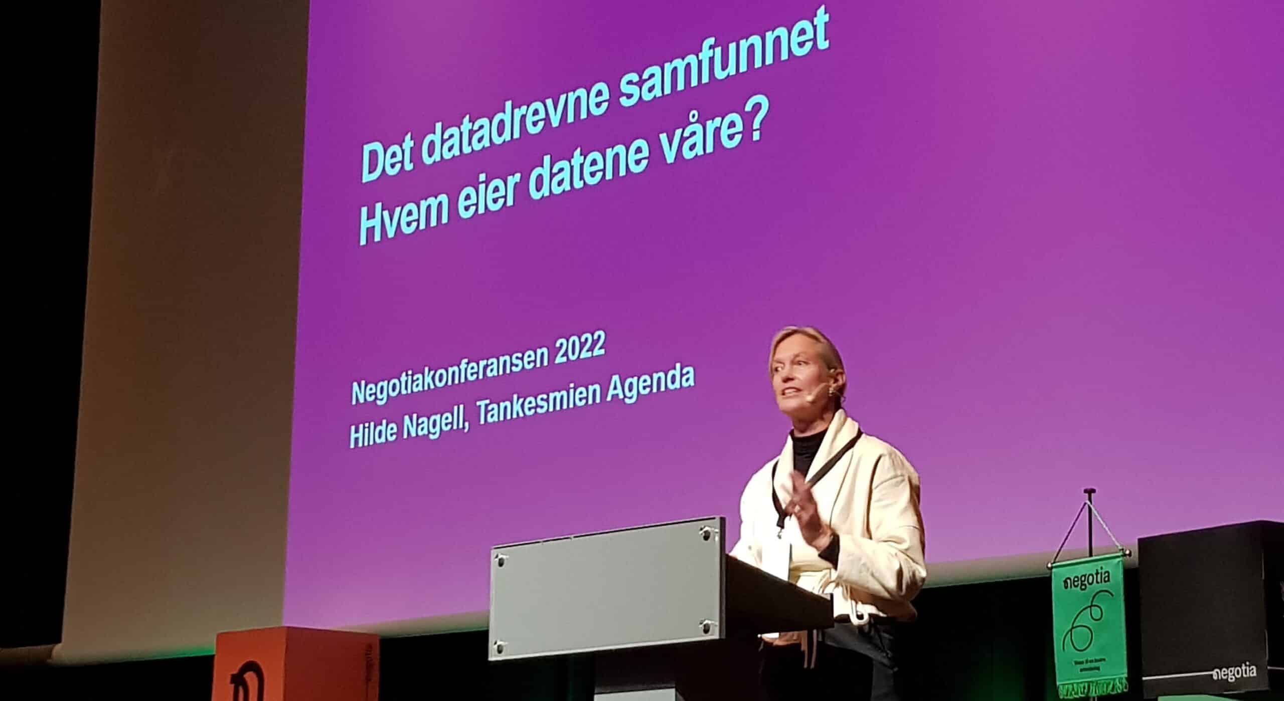 Første foredragsholder på podiet var Hilde Nagell, rådgiver i Tankesmien Agenda og forfatter av boka Digital revolusjon. Kjernen i innlegget hennes var spørsmålet om hvordan data skal reguleres og deles, enten det er snakk om design av offentlige digitale tjenester, eller systemer som påvirker arbeidsdagen til folk.