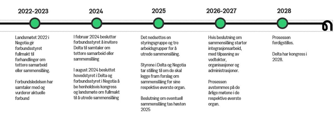 Sammenslåingen trer formelt i kraft 5. januar 2026. Deretter starter en organisasjonsutviklingsprosess som gjennomføres i faser fram til Deltas kongress høsten 2028.